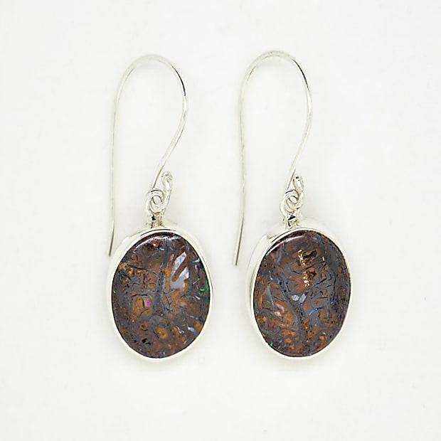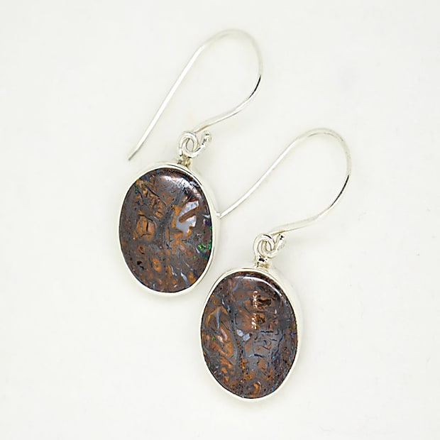 Australian Opal Earrings. Boulder Opal Patterned Round Stones with some Gem Green Fleck. Bezel Set in Sterling Silver, on Shepherd Hooks