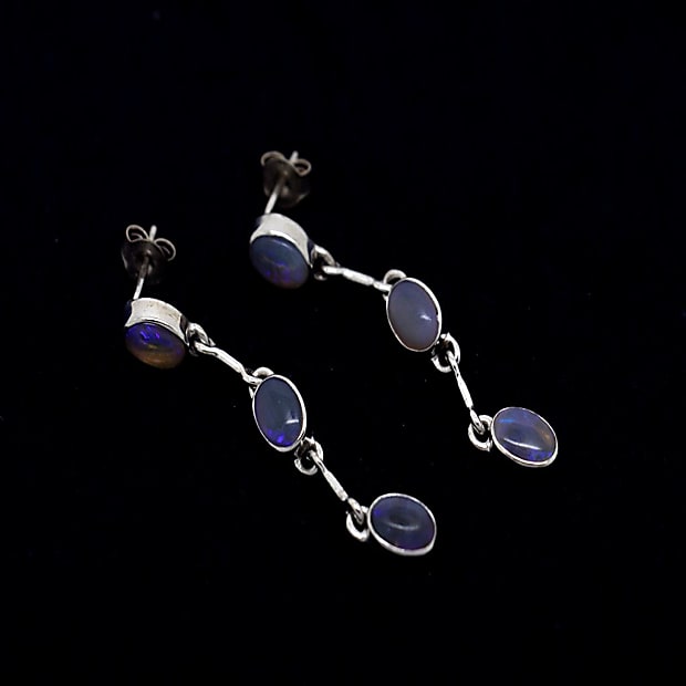 Opal Earrings. Australian Crystal Opal With Purple Hue. Hanging Drops. Set In Sterling Silver With Bar Separating 3 Stones.