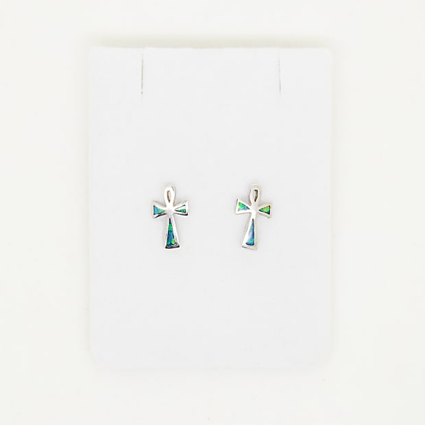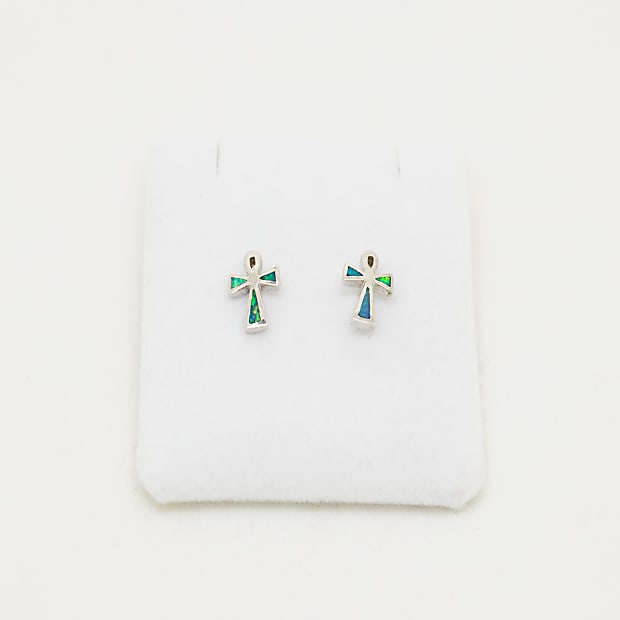 Opal Earrings. Australian Opal Gem, Bright Green. Inlayed In Sterling Silver Cross, Studs